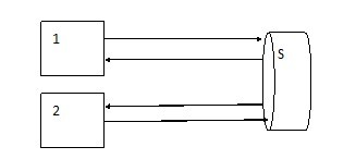建立一個中心光交換節(jié)點S,有設備1、2,每個設備都有輸入和輸出兩條通訊鏈路與S連接,此時結(jié)構(gòu)圖如下。