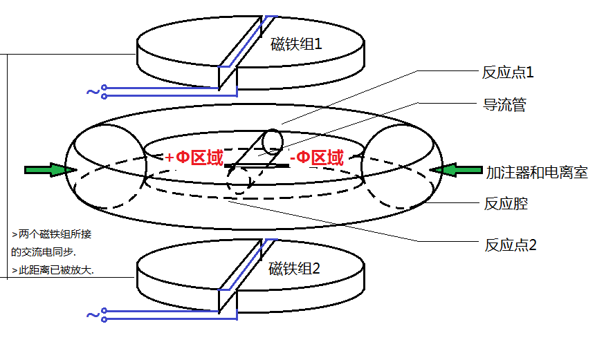 如圖, 兩組電磁鐵平行放置, 反應(yīng)腔夾于磁鐵之間. 每個(gè)電磁鐵組水平均分為兩半, 中間以狹縫隔開(kāi). 其線圈繞組使得在通交流電時(shí)兩半的磁場(chǎng)方向相反, 大小相同. 兩組電磁鐵通以同步高頻交流電, 于是就可以使兩組電磁鐵之間的半邊磁通量變化, 從而在反應(yīng)腔所在的位置產(chǎn)生渦旋電場(chǎng). 兩邊的渦旋電場(chǎng)在反應(yīng)腔中部橫穿的導(dǎo)流管處疊加. 導(dǎo)流管兩端自然產(chǎn)生主、副對(duì)撞點(diǎn), 即反應(yīng)點(diǎn)1和2. 反應(yīng)腔內(nèi)同時(shí)還存在水平方向同軸的環(huán)形磁場(chǎng)(此點(diǎn)與托卡馬克相同), 用于約束粒子沿環(huán)形軌跡運(yùn)動(dòng), 并在反應(yīng)點(diǎn)處收緊以壓縮等離子體.