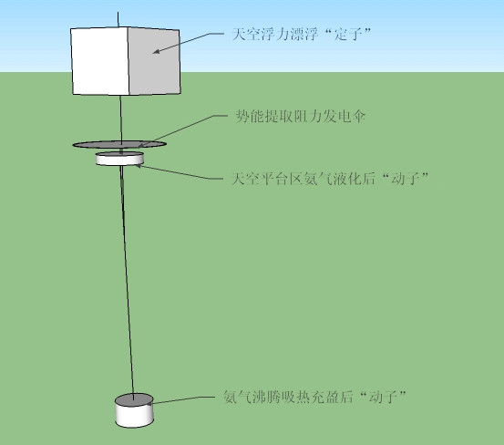 如上圖所示:設(shè)計(jì)一種系統(tǒng),在地面的時(shí)候“動(dòng)子”里面的物質(zhì)呈氣態(tài),而且單位體積明顯輕于空氣,就會(huì)形成比較大的浮力,使“動(dòng)子”具有上升的趨勢,放開“動(dòng)子”任其在浮力下,自由上升,當(dāng)上升到一定高度后,“動(dòng)子”內(nèi)的氣體由于溫度明顯下降而液化成液體,這時(shí)浮力消失,“動(dòng)子”在重力作用下會(huì)快速下落。這就形成了一個(gè)利用熱能、勢能、動(dòng)能之間相互轉(zhuǎn)化而形成的一個(gè)“永動(dòng)系統(tǒng)”而且能從外界獲取可觀能源來發(fā)電。只要做出“動(dòng)子”上升時(shí)保溫,上升到一定高度后能自由撤銷保溫狀態(tài)進(jìn)行熱交換就可以了。