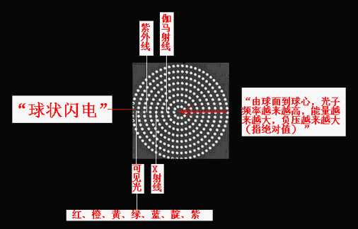 “棒電極”在球心對“球冠電極”“超短時間內(nèi)的高能”充電、放電,可以產(chǎn)生“球狀閃電”,其機理為:“雙向激擊”、“球冠振蕩”。因為“球冠振蕩”的頻率的不同,“球狀閃電”內(nèi)部呈現(xiàn)“嵌套球狀”,由外向里頻率由小到大,在可見光波段由外向里顯現(xiàn)為紅、橙、黃、綠、藍、靛、紫,而由外向里看,因疊加合成呈現(xiàn)白色,但是,當最外面的頻率較小時,也可能是黃色或綠色或藍色的;一個大“光球”,可以分離為兩個或幾個小“光球”,但其顏色將會“變深”。[3][4]
