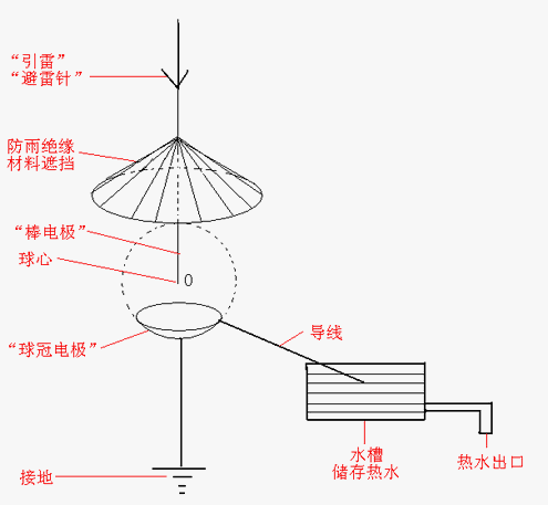 如圖7,可以在“雷擊村”,或其他發(fā)生“閃電”較多的區(qū)域,并且遠離居民區(qū)的地方,放置一些大大小小的“棒電極——球冠電極”?!鞍綦姌O”樹立于空中,用于招引閃電,類似于“避雷針”,但必須與其接地的支撐物絕緣,并且深入到“球冠電極”球心的頂端部位,越細越好——越細激發(fā)的“球狀閃電”的能量越大?!扒蚬陔姌O”的頂端接地,在其邊沿接一導線引入水槽,在閃電放電時,產(chǎn)生的“球狀閃電”可以沿導線進入水槽,“球狀閃電”所含的部分能量——熱能可以加熱水,這樣“閃電”的能量,就可以通過“接轉(zhuǎn)”為“球狀閃電”,再把可以“暫時儲存能量”的“球狀閃電”的部分能量——熱能傳給水,人們就可以利用熱水用于工業(yè)生產(chǎn)或日常生活了。