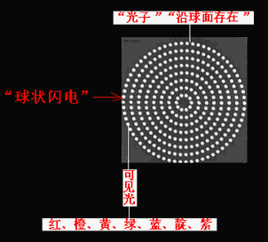“棒電極”在球心對“球冠電極”“超短時間內(nèi)的高能”(超高壓)充電、放電,可以產(chǎn)生“球狀閃電”,其機理為:“雙向激擊”、“球冠振蕩”。若地面為“球冠電極”,則表現(xiàn)為“滾地雷”“火球”,若空中云為“球冠電極”,則表現(xiàn)為空中“光球”。因為“球冠振蕩”的頻率的不同,“球狀閃電”內(nèi)部呈現(xiàn)“嵌套球狀”,由外向里頻率由小到大,在可見光波段由外向里顯現(xiàn)為紅、橙、黃、綠、藍、靛、紫,而由外向里看,因疊加合成呈現(xiàn)白色,但是,當最外面的頻率較小時,也可能是黃色或綠色或藍色的;一個大“光球”,可以分離為兩個或幾個小“光球”,但其顏色將會“變深”(如圖6、7)。 [6]