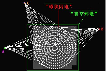 如圖12,A、B、C等處的光源發(fā)出的光線,在通過“球狀閃電”時,都在“球狀閃電”中的“光子流體能量負壓”的作用下,被“吸入”“留住”作“圓周運動”,而不能穿過“球狀閃電”,光源對面的觀察者將不能看到這個光源發(fā)出的光線——呈現(xiàn)“黑洞效應”。